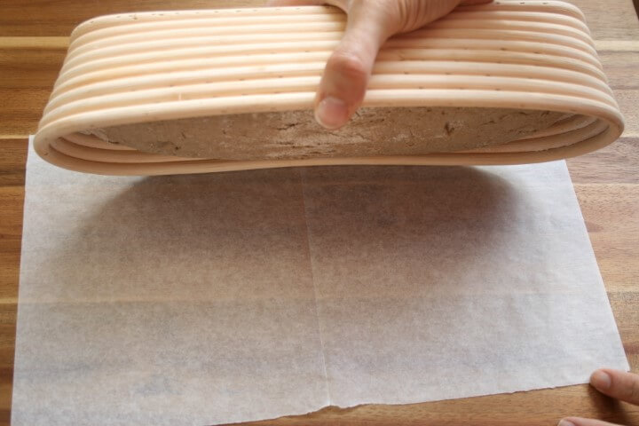 - הפיכת הסלסלה על המגש המקומח/נייר האפייה, איתו תכניסו את הבצק פנימה.